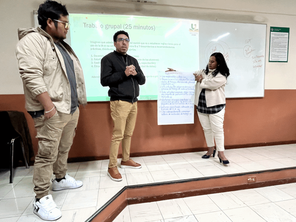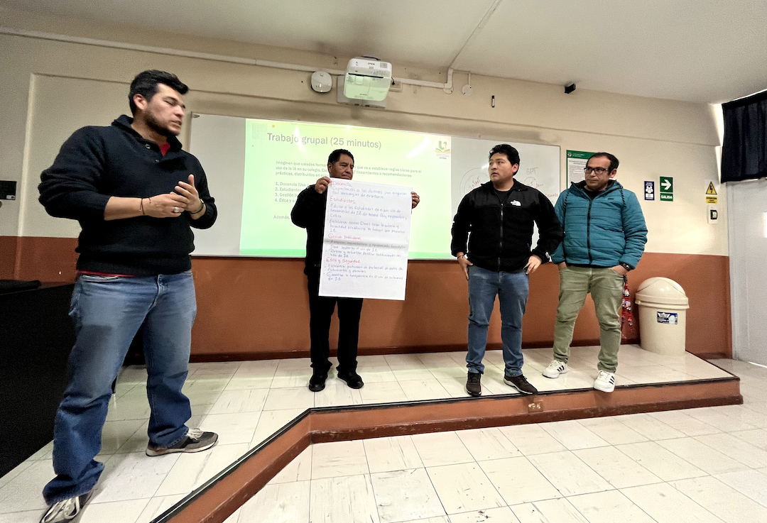 El momento más valioso fue, sin duda, el trabajo en equipos. A cada grupo le pedí que propusiera entre cinco y siete lineamientos para usar IA en su colegio, organizados en cuatro categorías: Docencia, Estudiantes, Gestión Institucional y Ética y Seguridad.