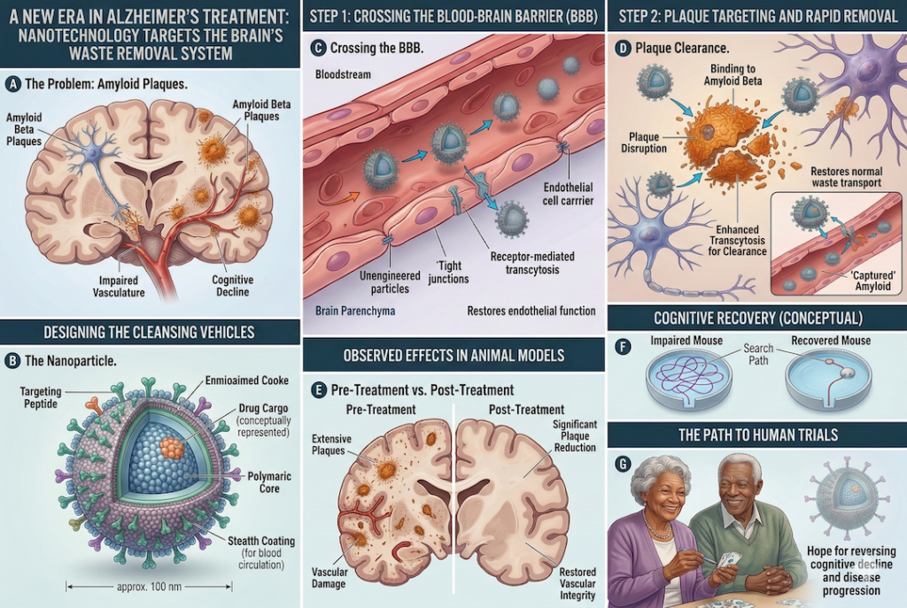 El estudio detalla cómo estas nanopartículas de diseño actúan como «vehículos de limpieza» especializados. Al entrar en el torrente sanguíneo, son capaces de cruzar la barrera hematoencefálica —una frontera biológica que suele impedir el paso de la mayoría de los medicamentos— y unirse a las proteínas beta-amiloides que forman las placas seniles. Una vez unidas, facilitan su transporte hacia afuera del cerebro para que puedan ser eliminadas por el propio organismo.