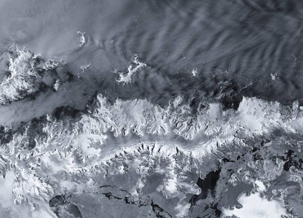 Esta imagen es en blanco y negro, lo que muestra el contraste entre el océano y el paisaje helado de la península.