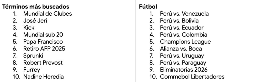 Finalmente, la cultura pop y los fenómenos virales mantuvieron su lugar. Desde la curiosidad por expresiones virales como “¿Qué significa Tralalero tralala?” hasta el interés por estrenos de ciencia ficción y terror como “El Juego del Calamar”, “Destino Final” y “El Conjuro 4”. Plataformas nuevas como “Kick” y juegos o tendencias como “Sprunki” también aparecieron en el radar, señalando la constante evolución de los hábitos de consumo digital de los peruanos.