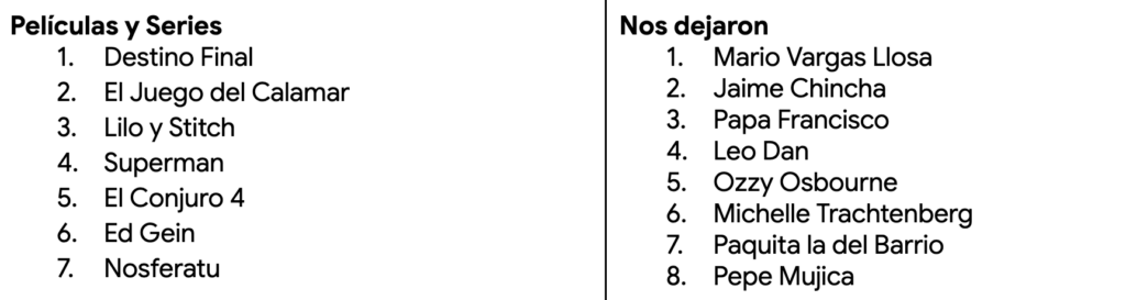 El 2025 será recordado también por el impacto emocional de las pérdidas, las cuales generaron picos masivos de tráfico. La sección “Nos dejaron” y las preguntas de “¿Cuándo…?” registran el duelo colectivo digital por figuras de talla monumental. El reporte destaca búsquedas relacionadas con el fallecimiento de personalidades como el escritor Mario Vargas Llosa y el Papa Francisco, eventos que motivaron consultas sobre sus biografías y detalles de sus decesos, como “¿Cuándo murió el Papa Francisco?”. Estas tendencias confirman la función de internet como un espacio de obituario global y memoria colectiva.