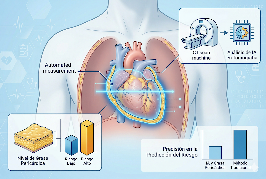 El núcleo de este avance radica en la medición de la grasa que rodea al corazón, conocida técnicamente como grasa pericárdica. Aunque siempre se sospechó de su relevancia, su medición manual era compleja y poco práctica en el día a día clínico. Ahora, gracias a algoritmos de aprendizaje profundo, esta información puede extraerse de forma automática a partir de las tomografías estándar de calcio en arterias coronarias que ya se realizan a miles de pacientes.