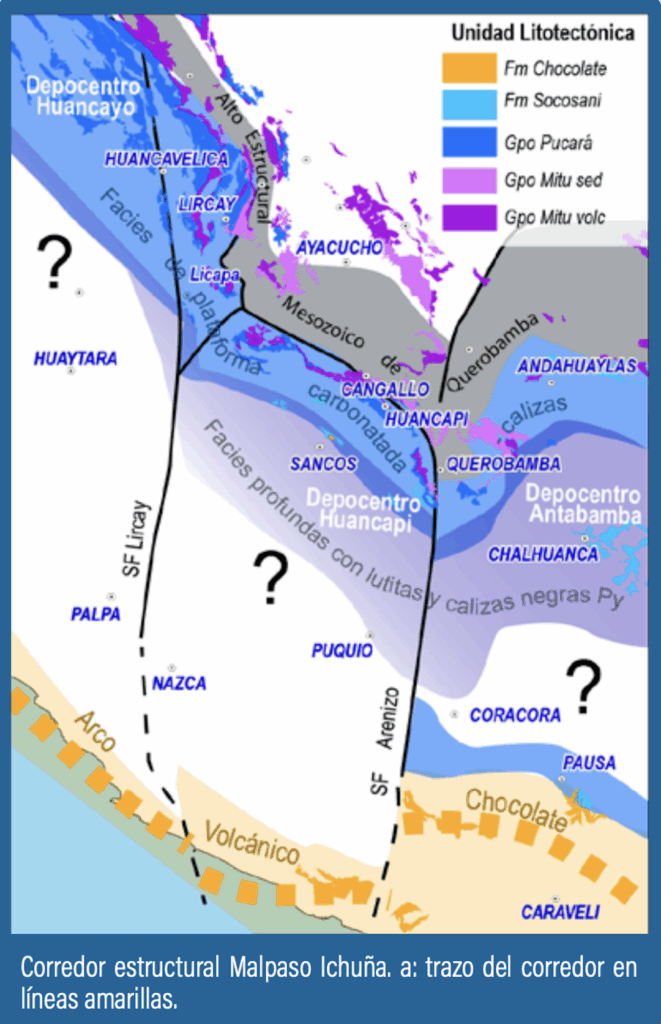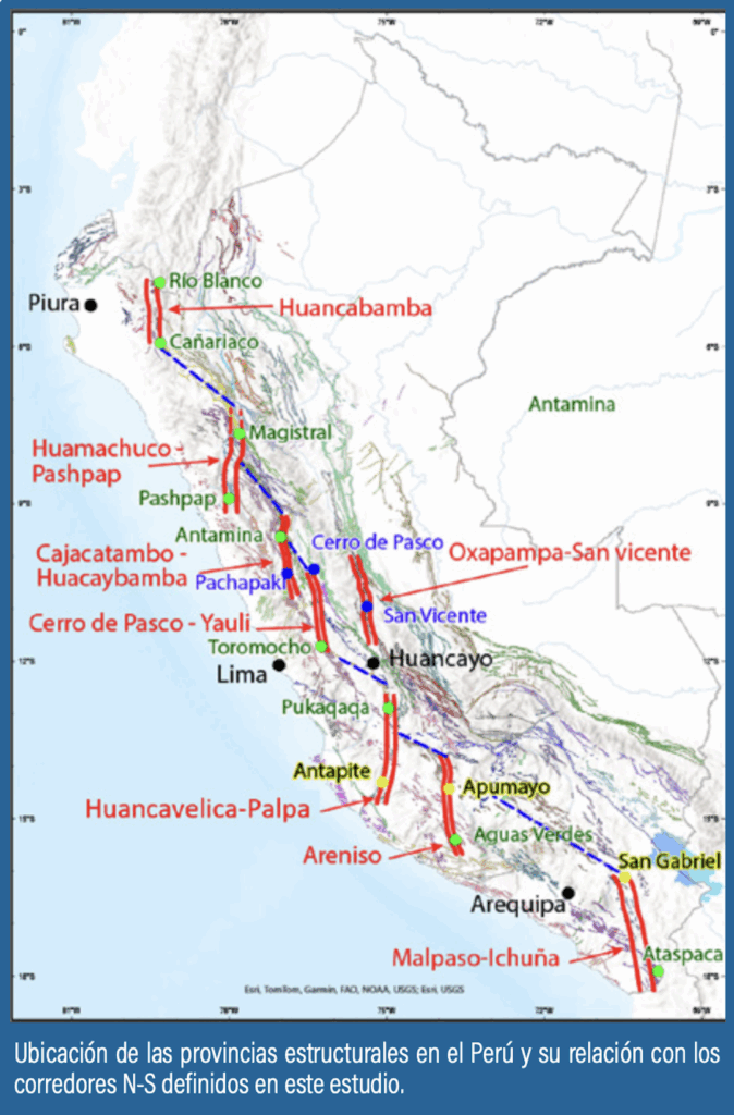 La evidencia es contundente, pues muchos depósitos importantes se alineaban exactamente sobre estas estructuras, confirmando su papel como controles del emplazamiento mineral. Entre los corredores identificados se encuentran el Malpaso-Ichuña, en el sur, que está vinculado a pórfidos como Toquepala y Quellaveco; el corredor Areniso, asociado a minas como Catalina Huanca y Apumayo; y el corredor Huancavelica-Palpa, en donde se ubican Pukaqaqa, Caudalosa y Recuperada. En el centro del país, el corredor Cerro de Pasco-Yauli reúne gigantes del cobre y el plomo como Toromocho, Cerro de Pasco y Colquijirca. En el norte, el corredor Huancabamba alberga proyectos cupríferos de gran magnitud como Río Blanco, Cañariaco y La Granja.