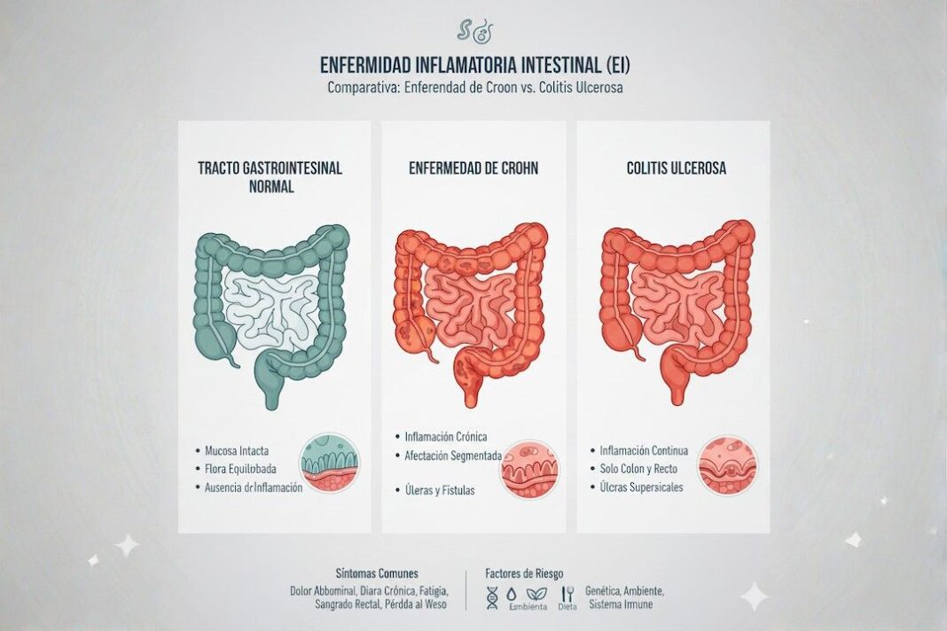 La EII se caracteriza por una inflamación persistente del tracto gastrointestinal que, si no se trata adecuadamente, termina ocasionando daños severos en los tejidos. Aunque la ciencia aún no determina una causa exacta, se sabe que responde a una acción anómala del sistema inmune influenciada por factores genéticos, ambientales y dietéticos. Los síntomas, que incluyen dolor abdominal, fatiga extrema, sangrado rectal y pérdida de peso, impactan no solo el bienestar físico, sino también la salud emocional de quienes la padecen.